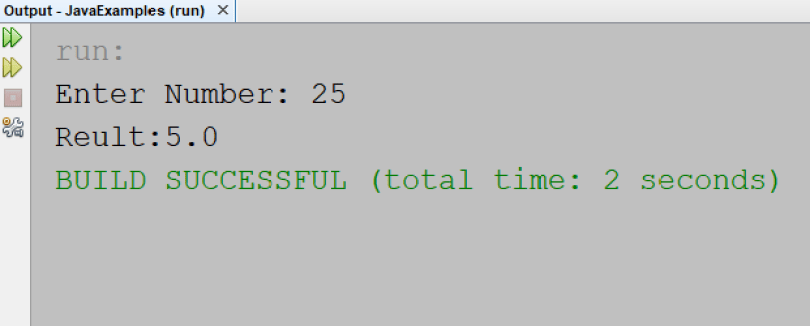 1 2 3 4 5 6 7 8 9 10 11 12 13 14 15 16 17 18 19 20 21 22 23 24 25 26 27 | package javaexamples; import java.util.Scanner; public class JavaExamples { public static void main(String[] args) { Scanner reader = new Scanner(System.in); System.out.print("Enter Number: "); double number = reader.nextDouble(); double result; double squareRoot = number / 2; do { result = squareRoot; squareRoot = (result + (number / result)) / 2; } while ((result - squareRoot) != 0); System.out.println("Reult:"+squareRoot); } } |