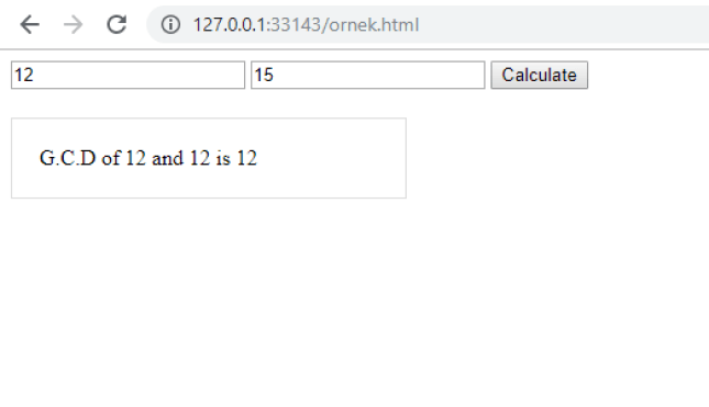 1 2 3 4 5 6 7 8 9 10 11 12 13 14 15 16 17 18 19 20 21 22 23 24 25 26 27 28 29 30 31 32 33 34 35 36 37 | <body> <input type="text" id="b1" placeholder="Enter first number"> <input type="text" id="b2" placeholder="Enter second number"> <input type="button" value="Calculate" id="btnCalc"> <div id="result" style="width:250px; border: 1px solid #ddd;position: absolute;top:50px;left:50;padding:20px"> </div> <script> function area(){ var n1=document.getElementById("b1").value; var n2=document.getElementById("b2").value; var result=document.getElementById("result"); n1=Number(n1); n2=Number(n1); let gcd = 1; for(let i = 1; i <= n1 && i <= n2; ++i) { // Checks if i is factor of both integers if(n1 % i==0 && n2 % i==0) gcd = i; } result.textContent= "G.C.D of "+n1+" and "+n2+" is "+gcd+" \n"; } var btnCalc=document.getElementById("btnCalc"); btnCalc.onclick=area; </script> </body> |