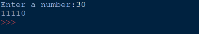 1 2 3 4 5 6 7 8 9 10 11 12 | def convertToBinary(n): # Function to print binary number for the input decimal using recursion if n > 1: convertToBinary(n//2) print(n % 2,end = '') # decimal number dec = int(input("Enter a number:")) convertToBinary(dec) |